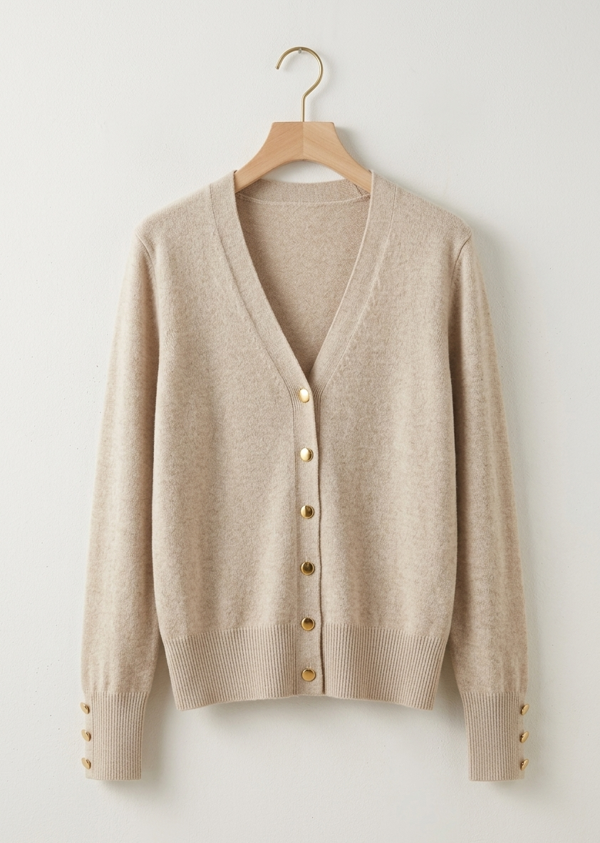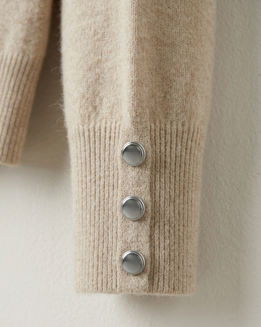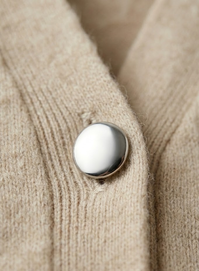 Más allá de su suavidad incomparable, este cárdigan destaca por sus botones metálicos de diseño jaspeado. Un detalle sutil y elegante que eleva la prenda y le otorga un carácter único y sofisticado.